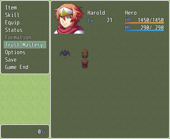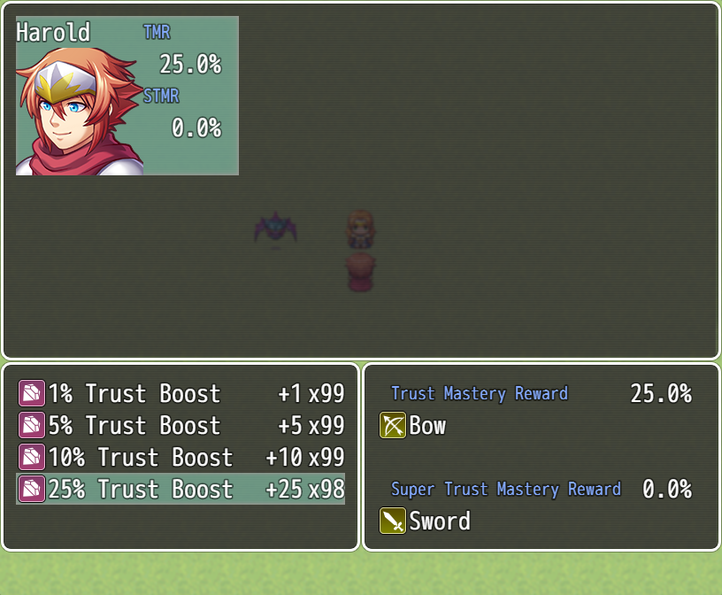 This plugin allows you to use specific items to increase your Trust Mastery on Actors, in addition to the core plugin's functionality of gaining Trust Mastery through battles. This is done through a brand new scene dedicated to Trust Mastery Rewards.