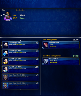 Trust Mastery Rewards were a feature of the now unavailable mobile RPG, Final Fantasy Brave Exvius. Each unit in the game, other than a rare few, each had an assigned "Trust Mastery Reward" that players could obtain by continuing to use the unit in battle or by using items gained in various ways to jump their completion percentage up by various amounts at once.